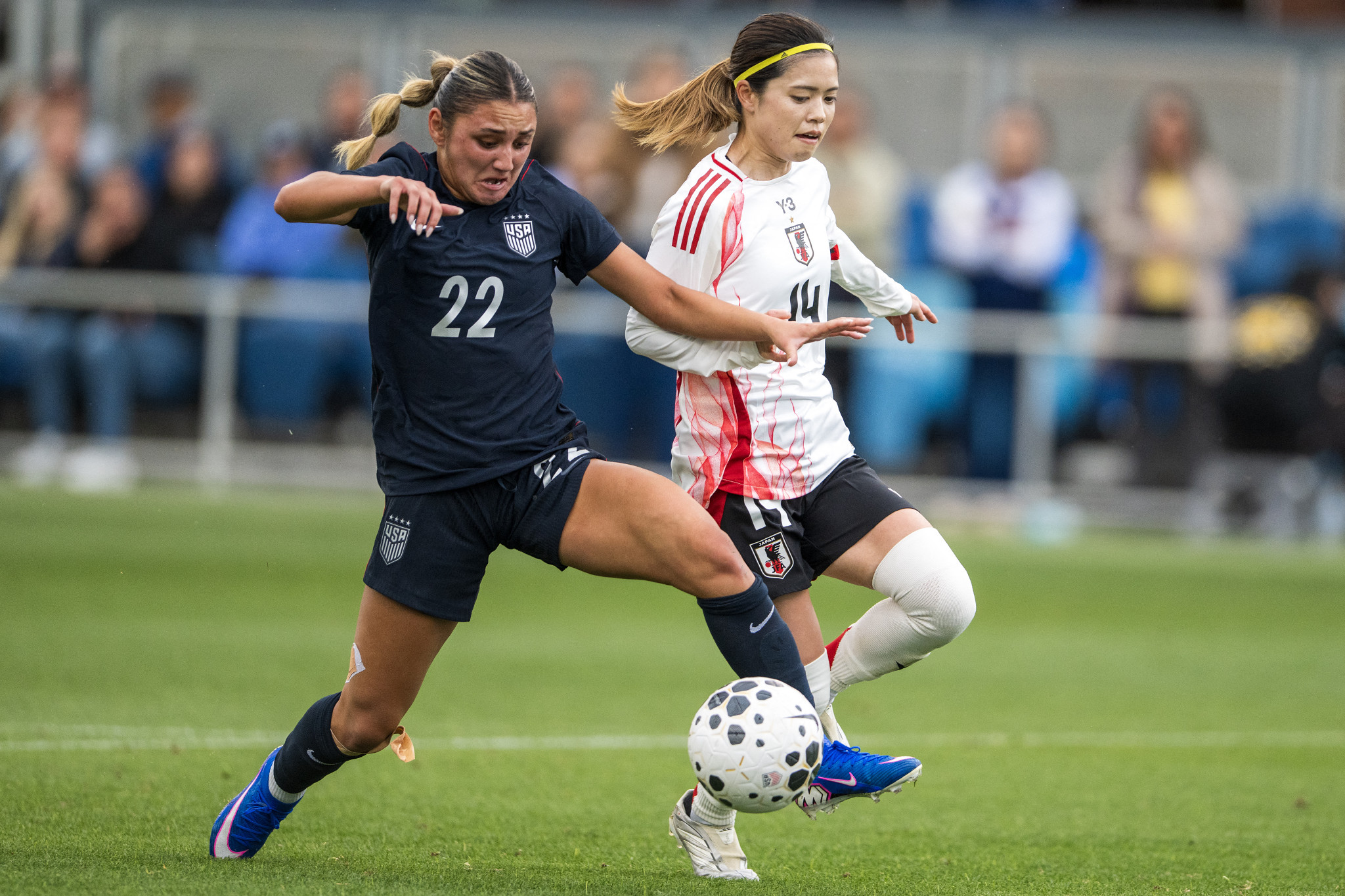 サッカー女子の国際親善試合は11日、米カリフォルニア州サンノゼで行われ、日本代表(なでしこジャパン)は米国代表に1―2で敗れた。写真は競り合う長谷川(右)。【AFP時事】