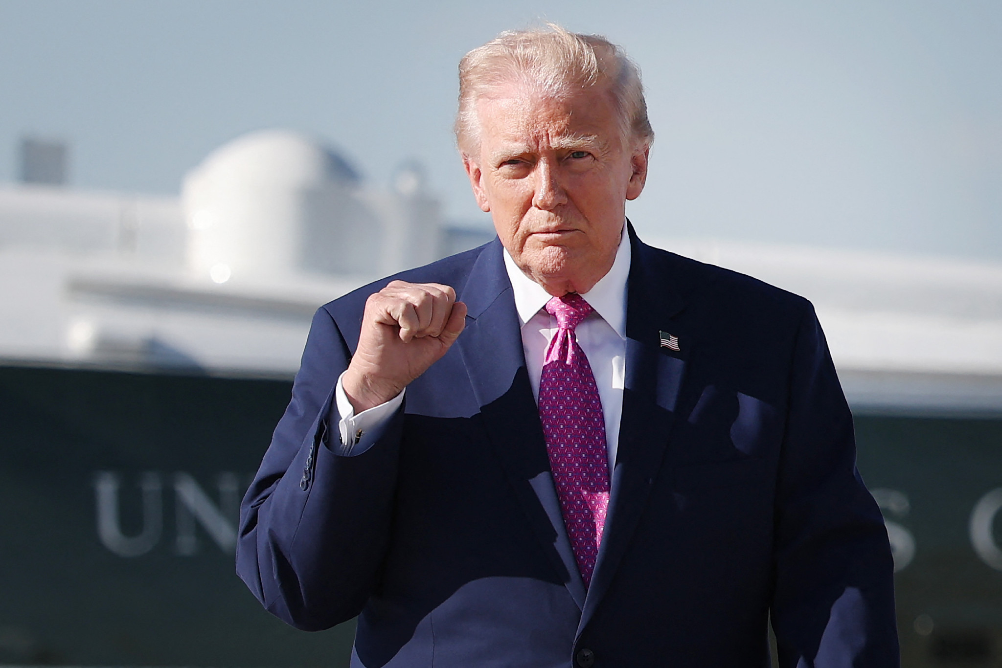 米軍は11日、イランが事実上封鎖する原油輸送の要衝ホルムズ海峡に敷設された機雷の除去に向け、環境整備を開始したと発表した。写真は10日、ワシントン郊外のアンドルーズ空軍基地で取材に応じるトランプ大統領【AFP時事】