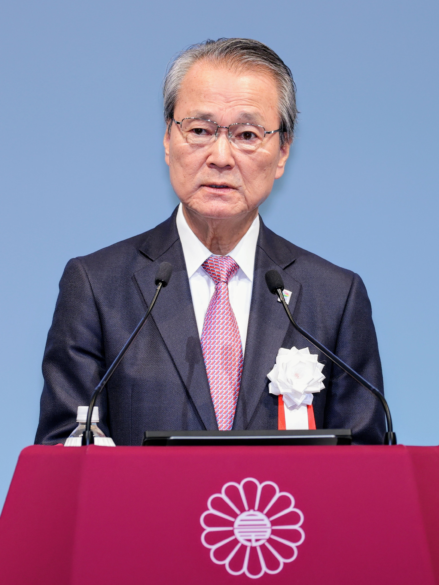 自民党大会であいさつする経団連の筒井義信会長=12日、東京都港区