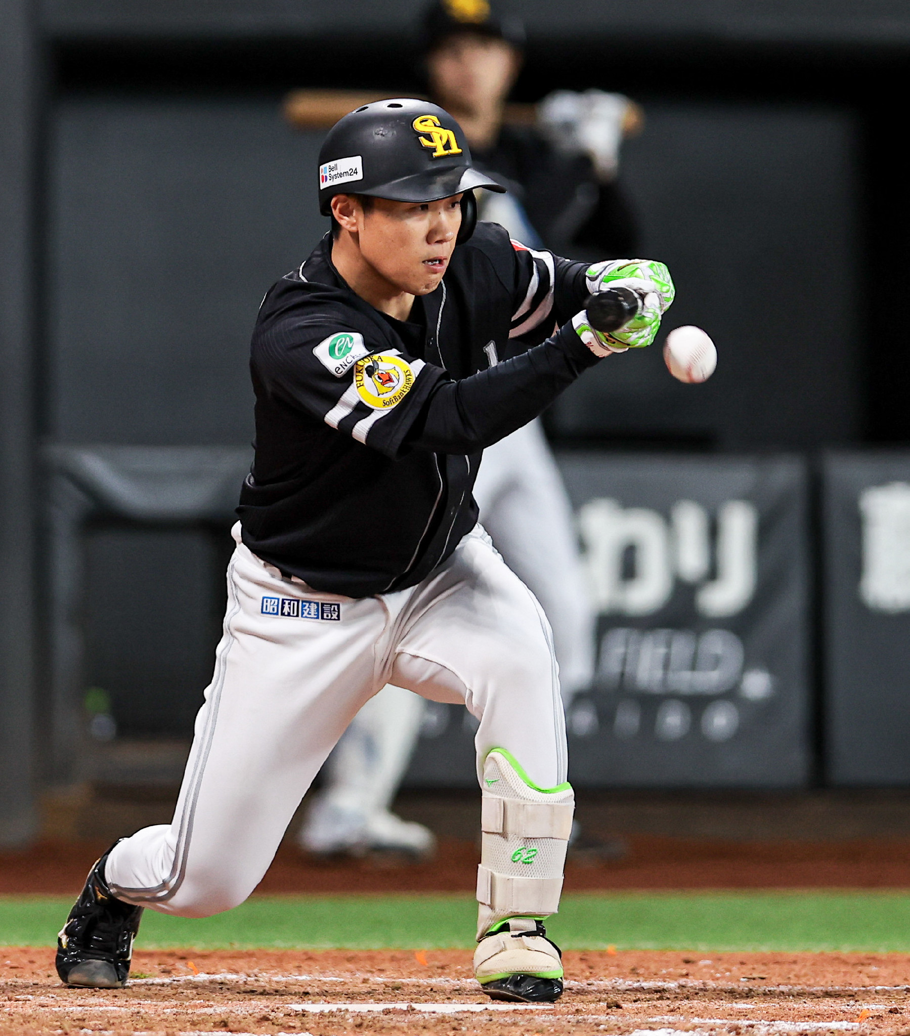 日本ハム―ソフトバンク。5回、同点のスクイズを決めるソフトバンクの海野=12日、エスコンF