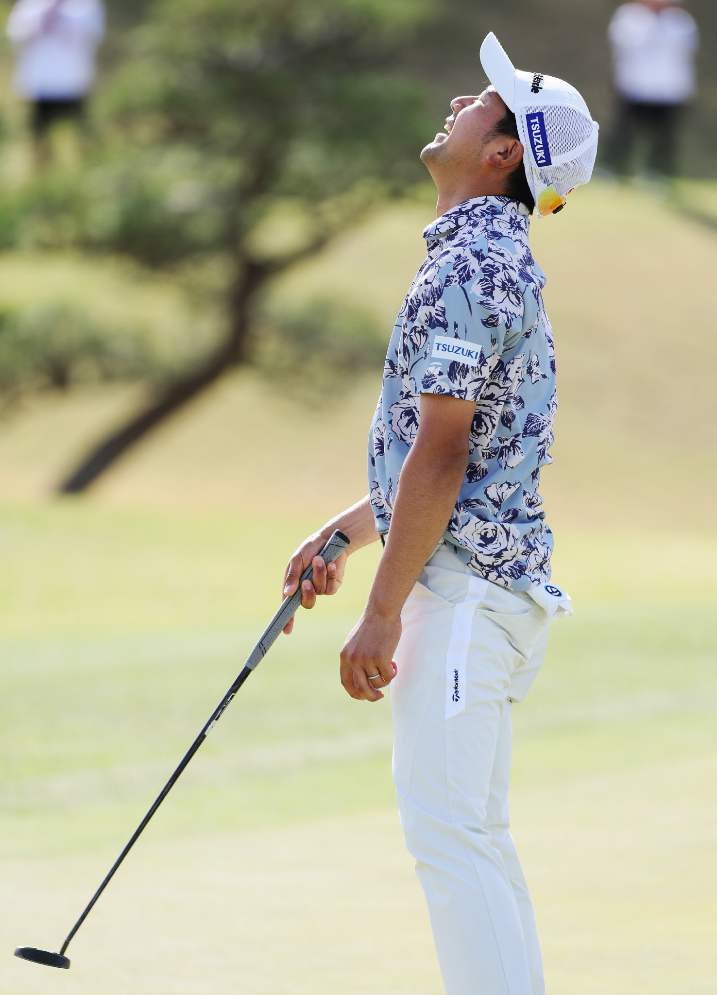 東建ホームメイト・カップ最終日。プレーオフ2ホール目、優勝を決め天を仰ぐ石坂友宏=12日、三重・東建多度CC名古屋