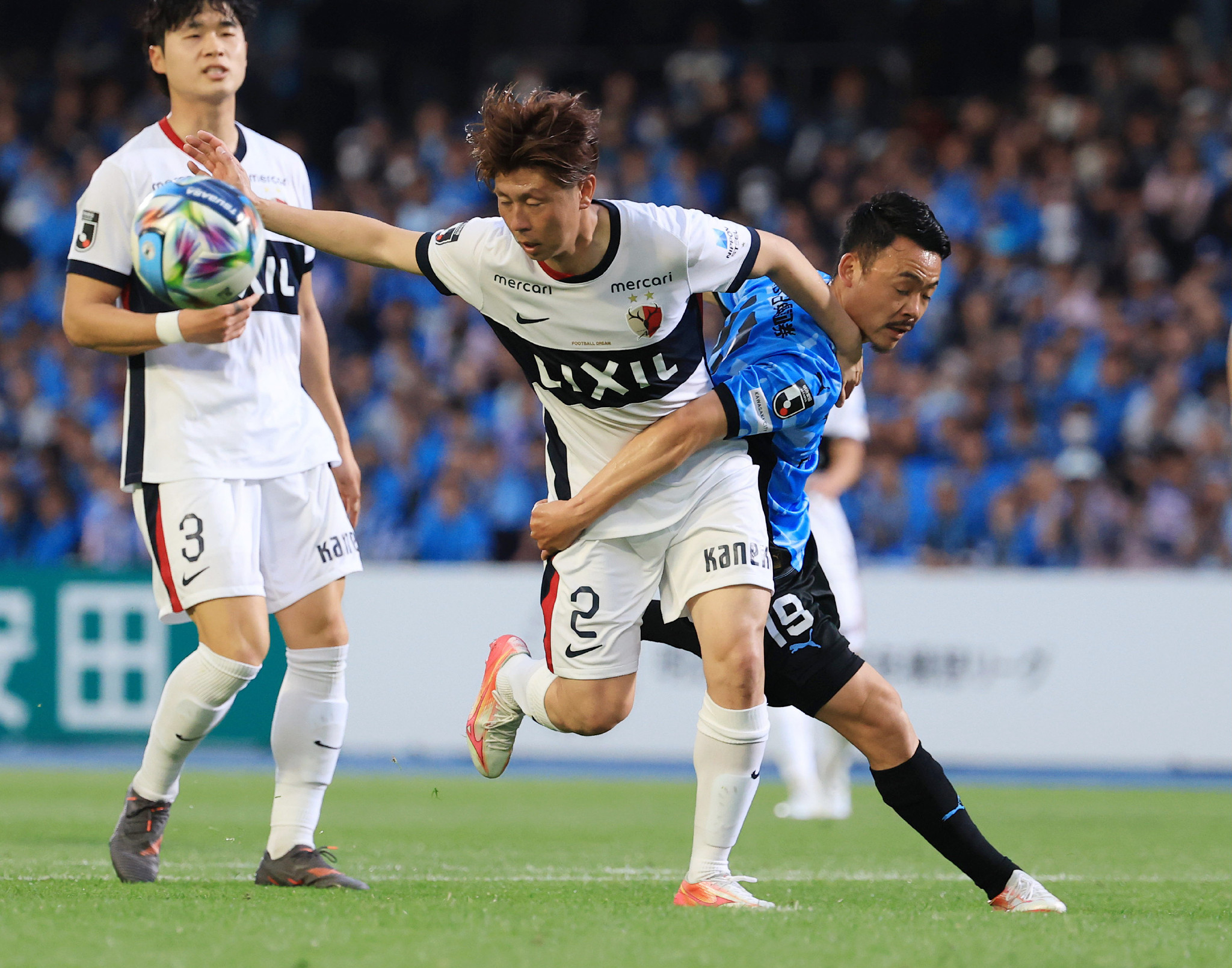 J1百年構想・川崎―鹿島。後半、競り合う川崎の河原(右端)と鹿島の安西(中央)=12日、U等々力
