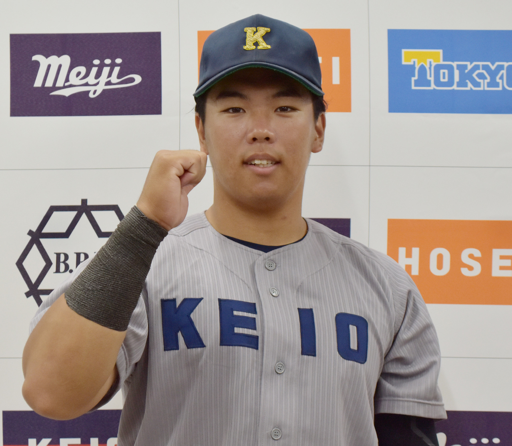 立大戦で活躍し、試合後にポーズを取る慶大の中塚=12日、神宮球場