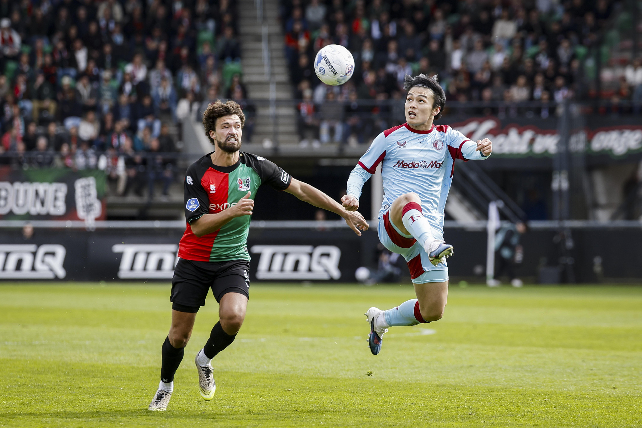 NECナイメヘン戦で競り合うフェイエノールトの上田(右)=12日、オランダ・ナイメヘン