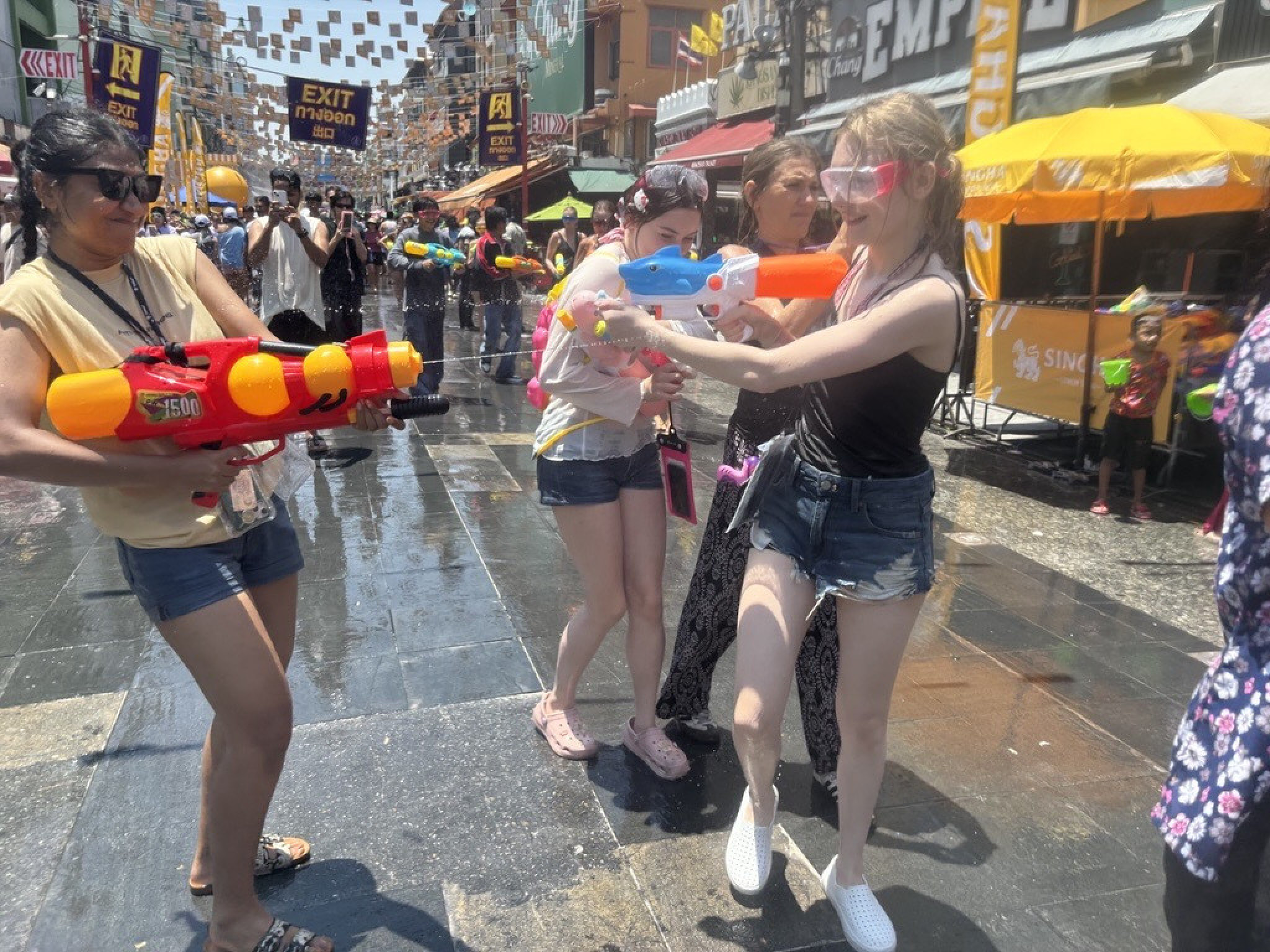 13日、タイの首都バンコクで水掛け祭りに参加する観光客ら。