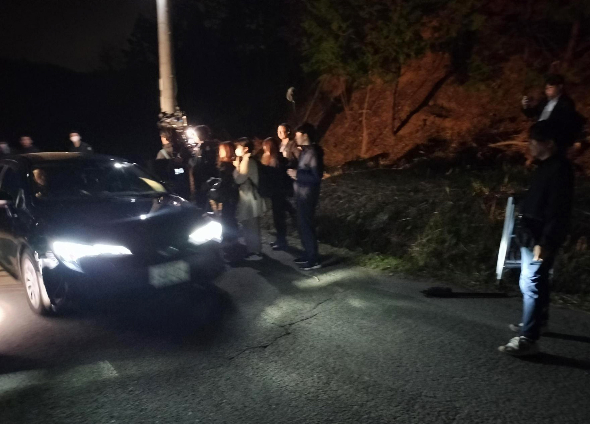 遺体が発見された現場付近を後にする捜査車両=13日午後、京都府南丹市