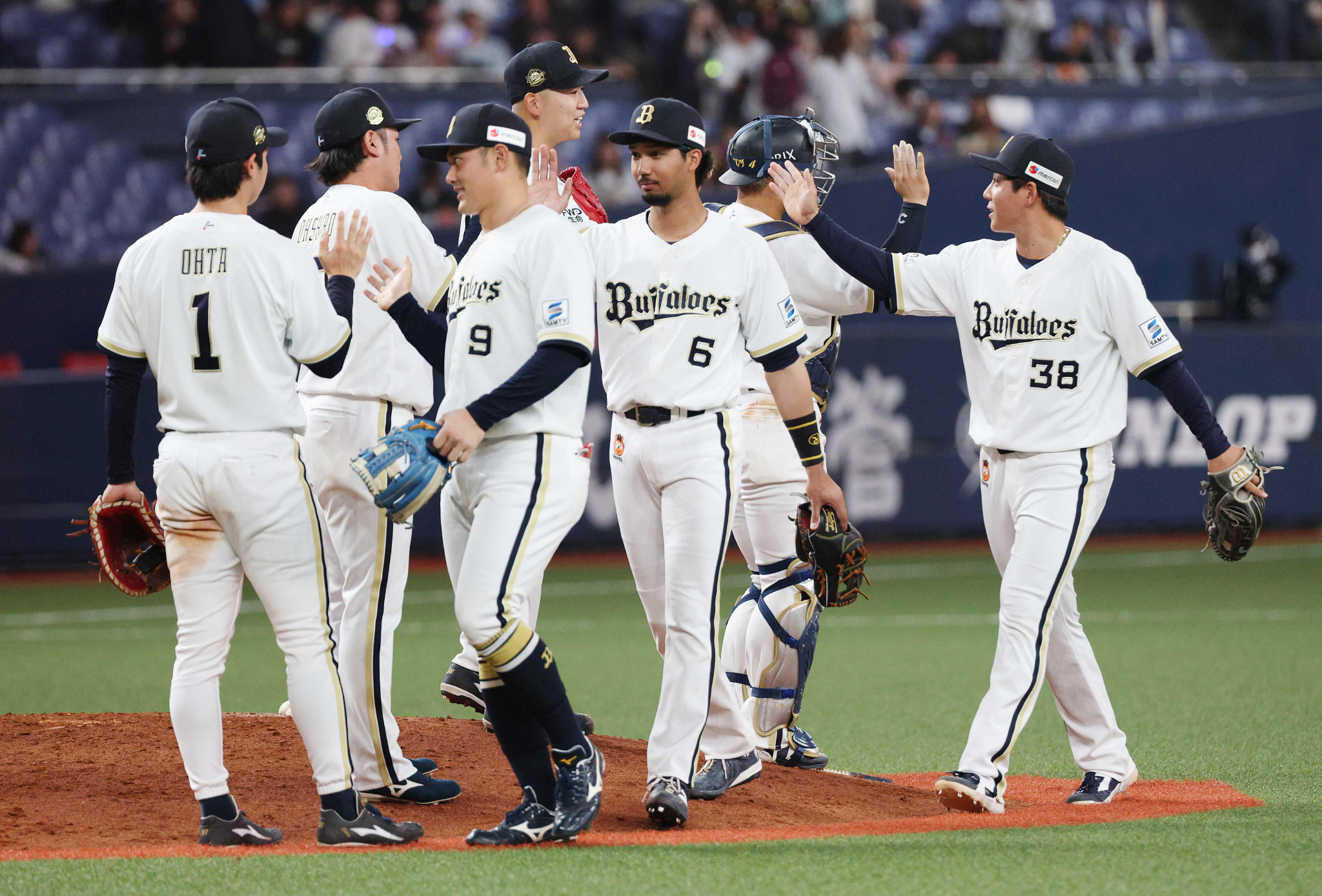 オリックスは1回にシーモアの併殺打の間に先制。5、6回に1点ずつ加えた。エスピノーザは内角を突き、6回無失点で3連勝。椋木がプロ初セーブ。写真は喜ぶオリックスナイン=15日、京セラドーム