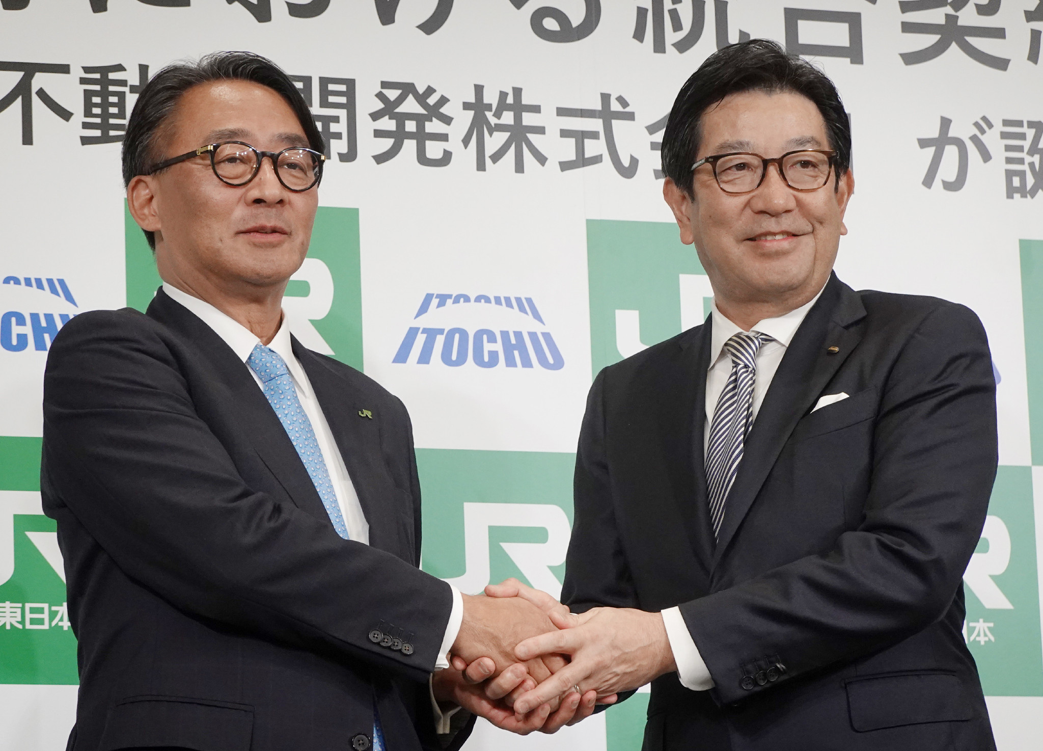 JR東日本と伊藤忠商事は15日、不動産事業を手掛ける新会社「JR東日本伊藤忠不動産開発」を10月をめどに設立すると発表した。写真はJR東日本の喜勢陽一社長(左)と伊藤忠商事の石井敬太社長=東京都