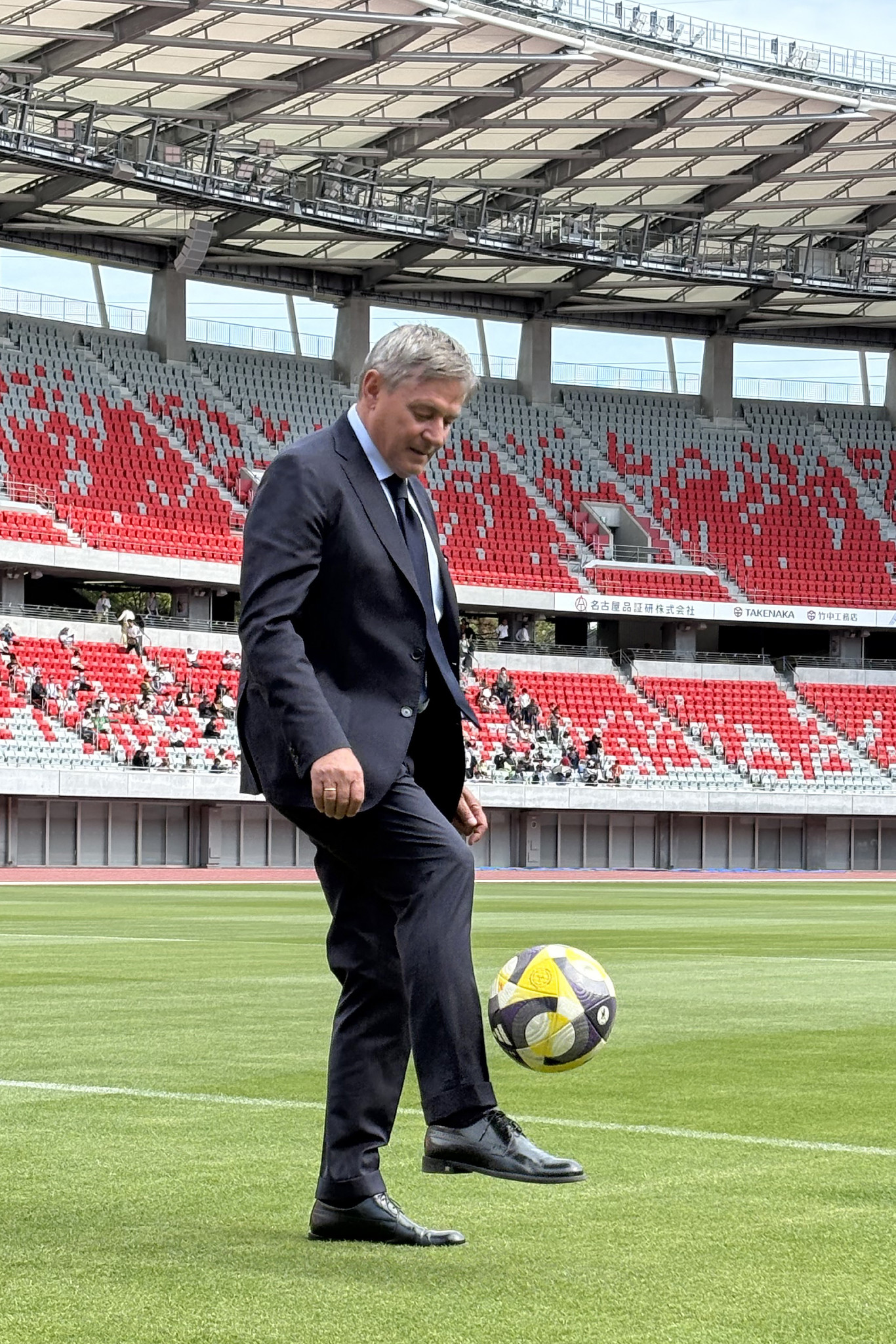 パロマ瑞穂スタジアムでリフティングするドラガン・ストイコビッチさん=18日、名古屋市