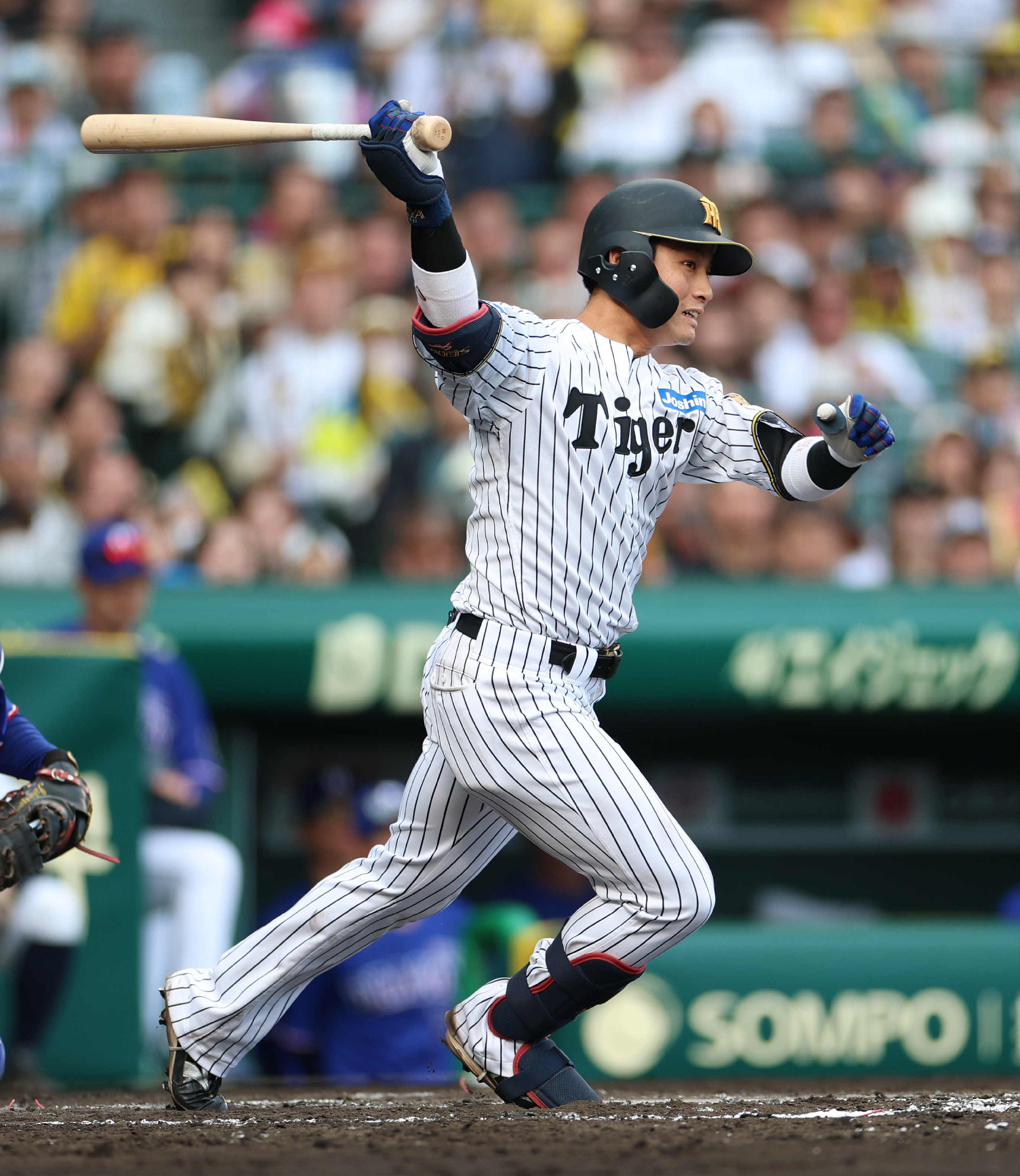 阪神―中日。7回、勝ち越し適時打を放つ阪神の木浪=18日、甲子園