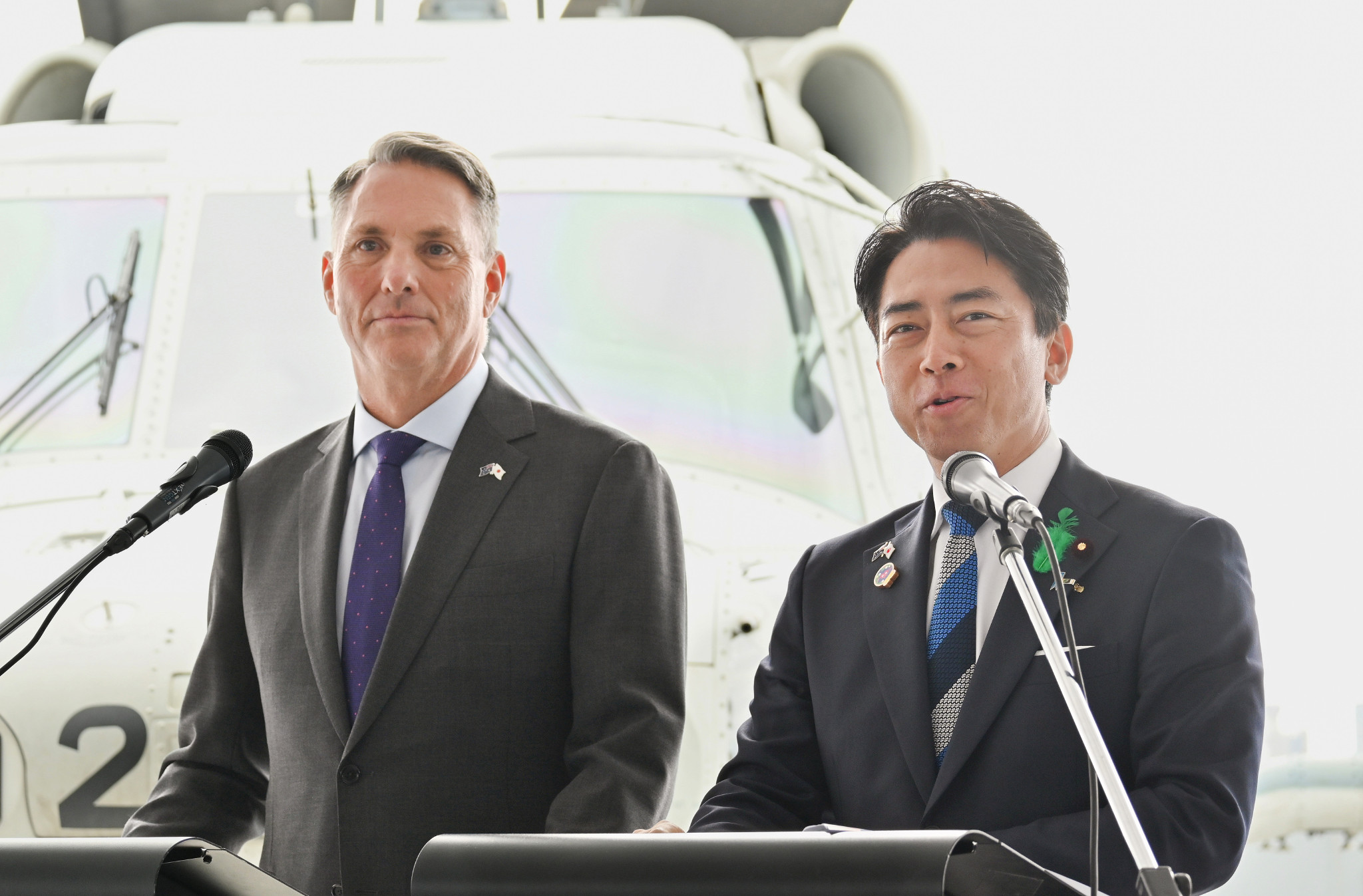 共同記者会見する小泉進次郎防衛相(右)とオーストラリアのマールズ国防相=18日、豪メルボルン