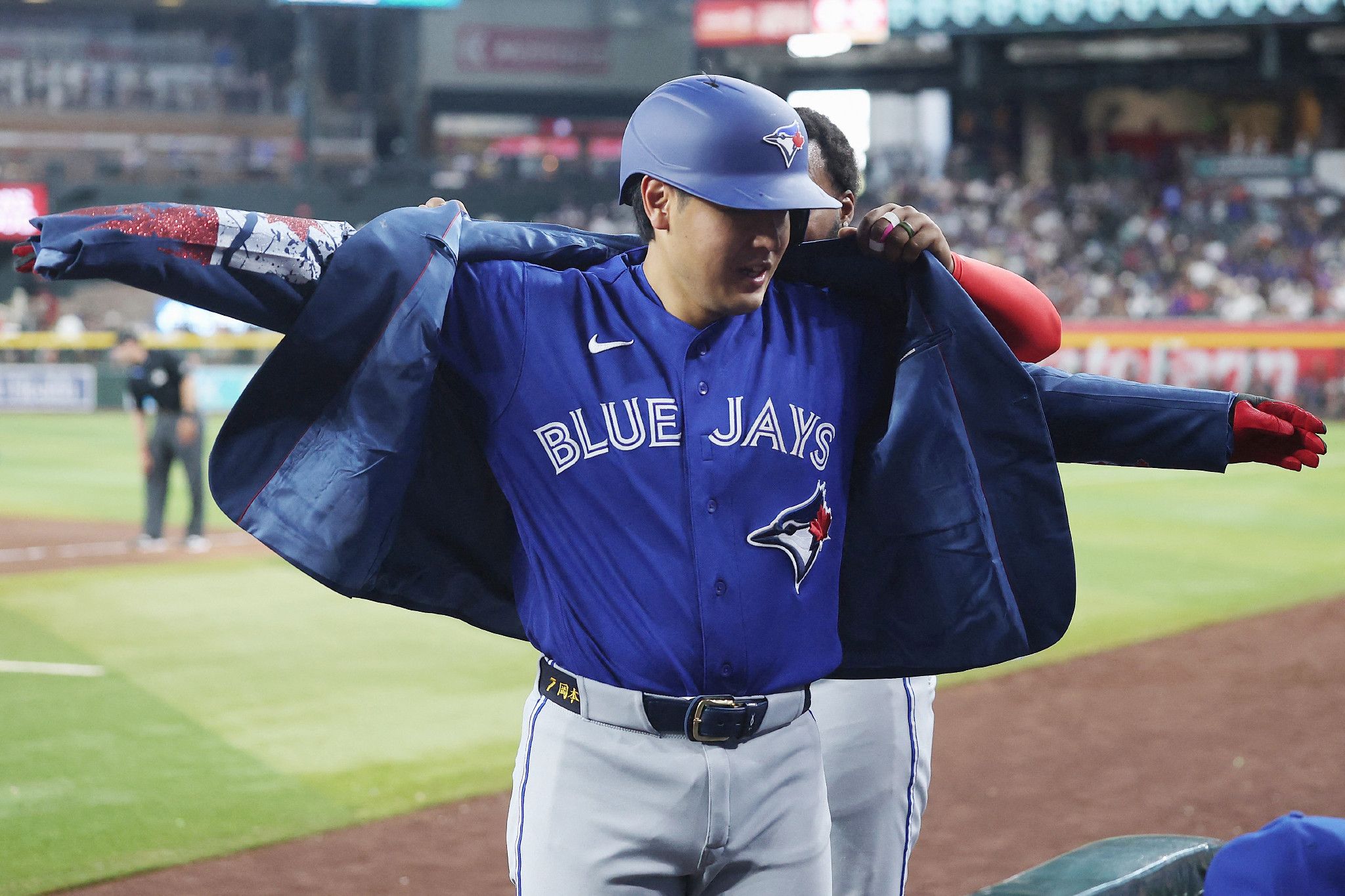 ダイヤモンドバックス戦の3回、ソロ本塁打を放って「ホームラン・ジャケット」を着せられるブルージェイズの岡本。7番三塁で出て4打数2安打3打点=19日、フェニックス【AFP時事】