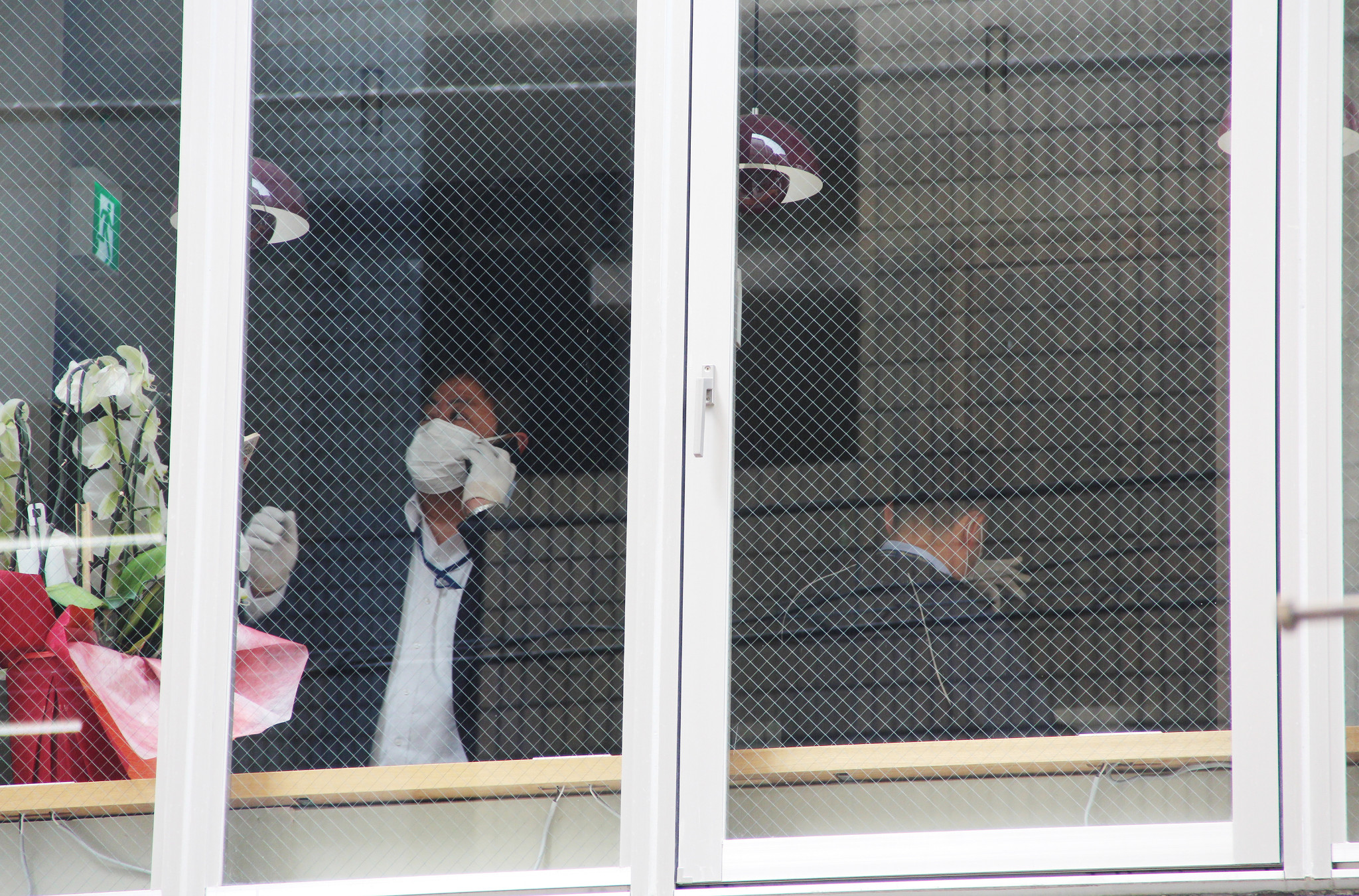 レンタルオフィスを捜索する捜査員