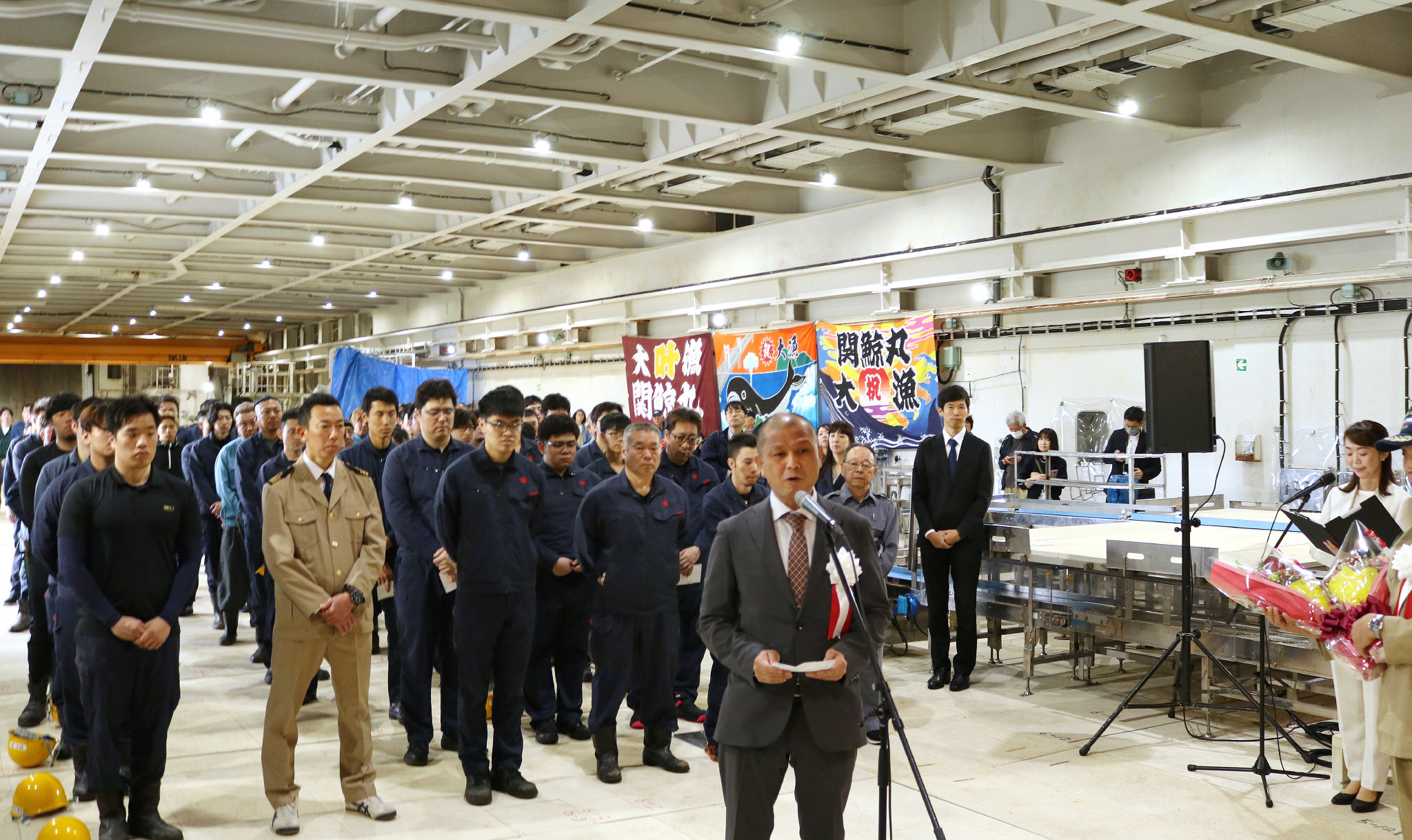 捕鯨母船「関鯨丸」が母港である山口県下関市の港に接岸し、船内で出漁式が行われた。恒川船団長は「活気付いてきているクジラ市場をさらに盛り上げていけるよう、乗組員一丸となって頑張る」とあいさつした=18日