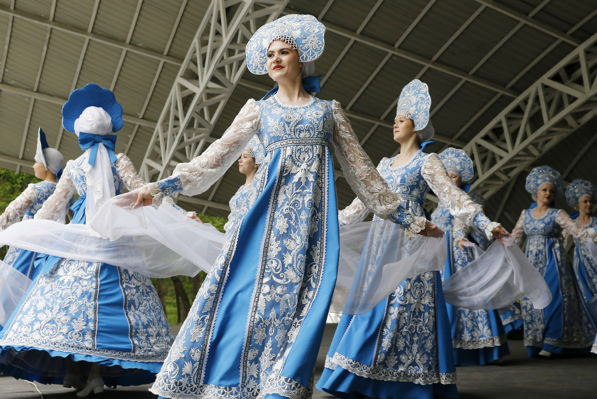 19日、中央アジアの旧ソ連構成国キルギスの首都ビシケクの公園で開かれた民族文化祭の開会式。アーティストが美しい衣装に身を包み、踊りを披露した。
