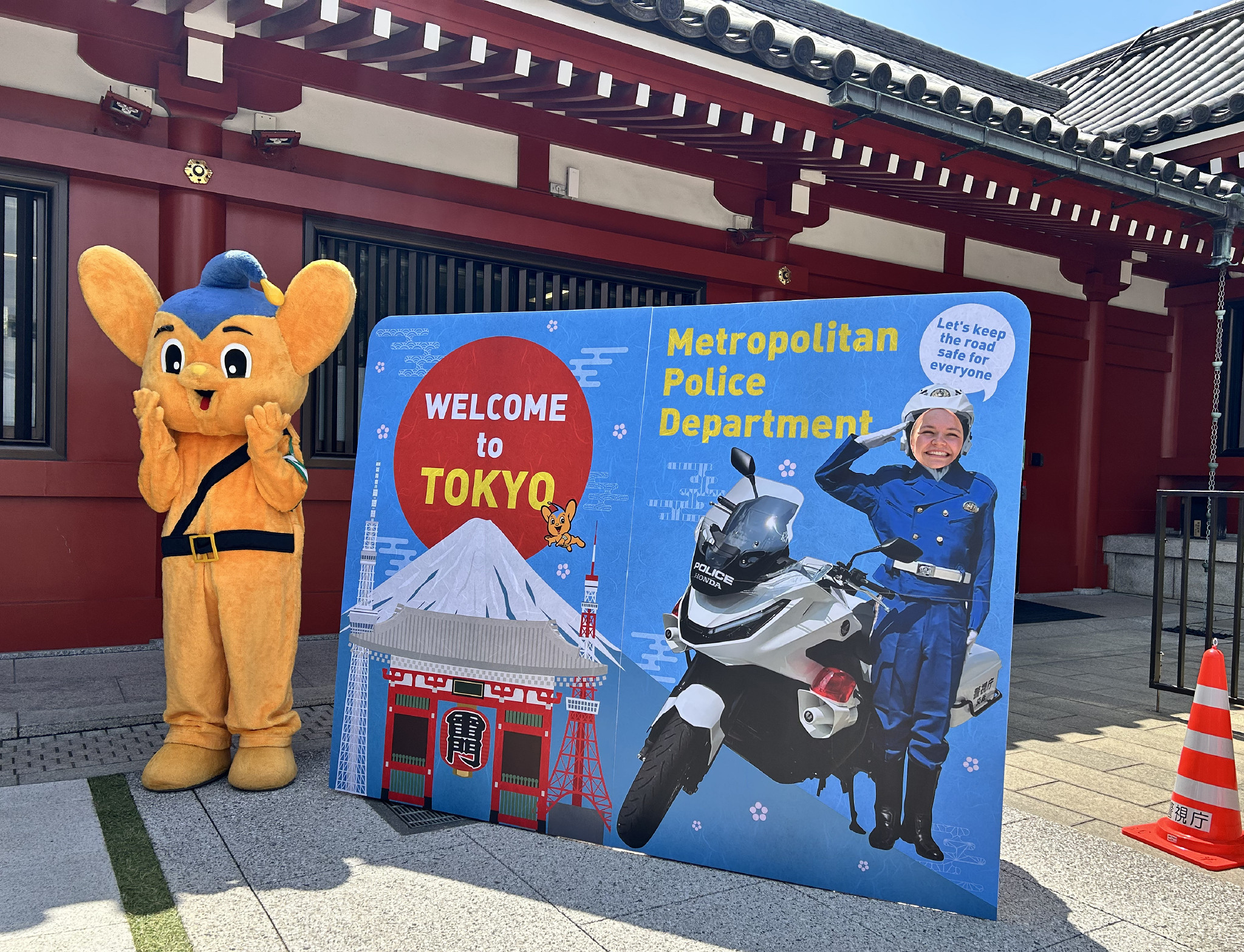 警視庁は20日、東京都台東区の浅草寺で、訪日外国人に交通ルールを楽しく学んでもらおうとキャンペーンを行った。顔出しパネルや、英語で交通ルールが書かれたキーホルダーなどで交通安全を呼び掛けた。