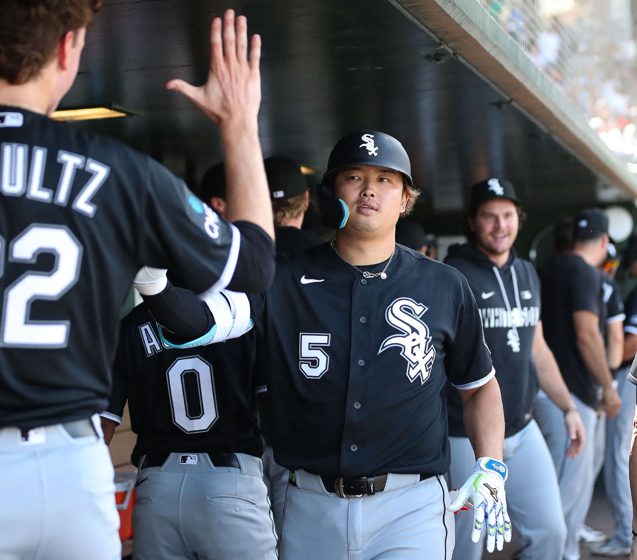 アスレチックス戦の5回、2ランを放ちチームメートに迎えられるホワイトソックスの村上=19日、サクラメント