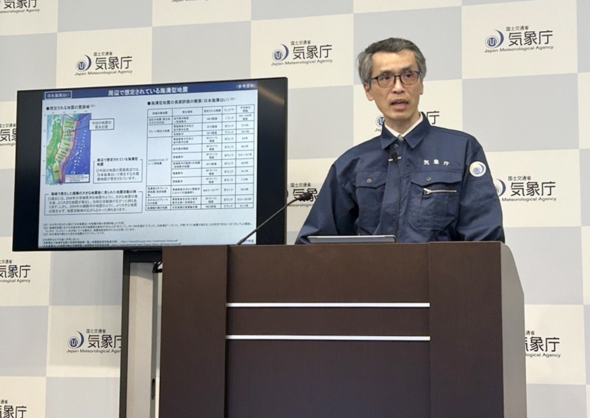 三陸沖を震源とする地震について記者会見する気象庁の清本真司地震津波対策企画官=20日午後、東京都港区