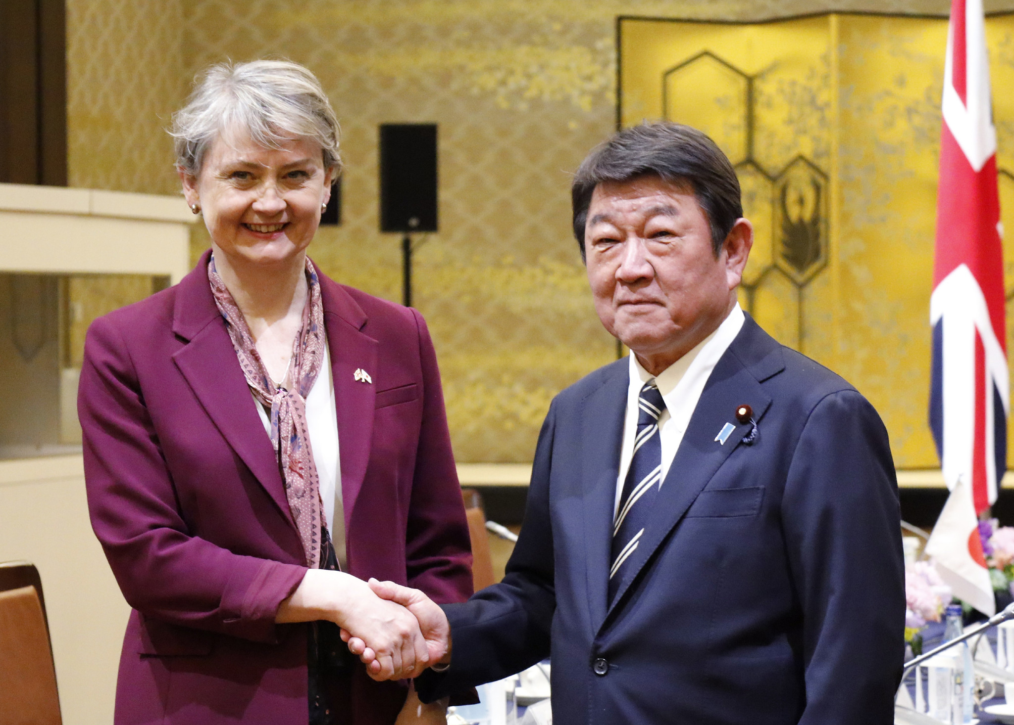 日英の外相戦略対話に臨む茂木敏充外相(右)とクーパー英外相=20日、東京都港区の外務省飯倉公館
