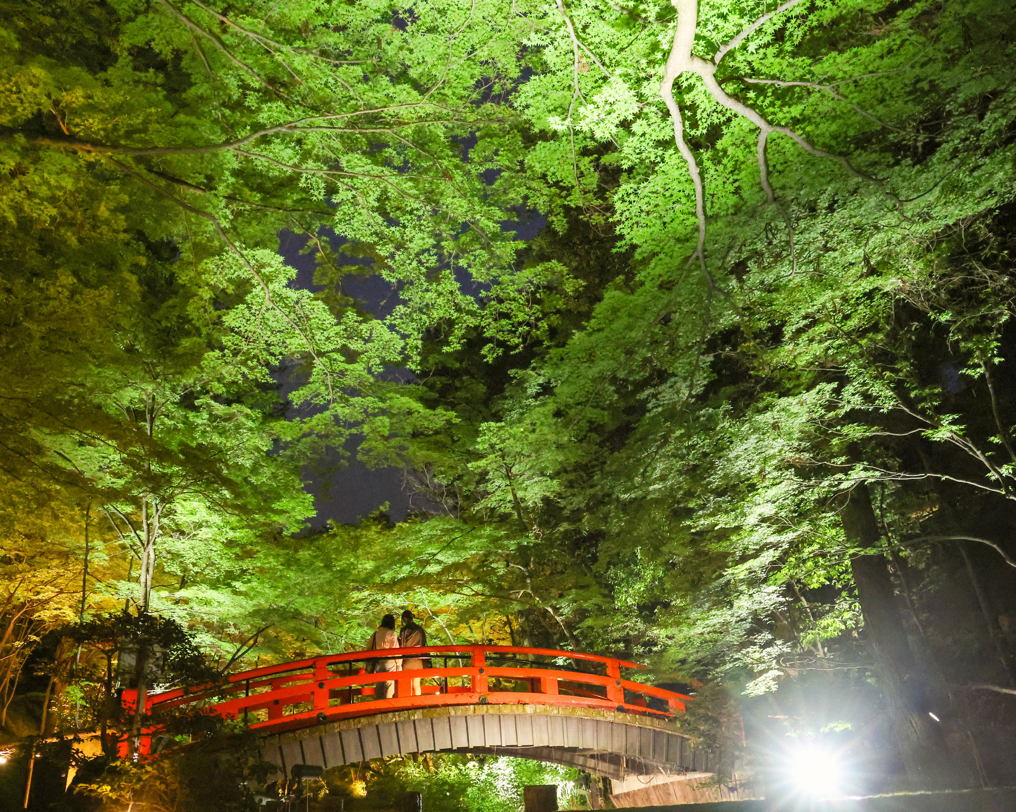 京都市上京区の北野天満宮にある「史跡御土居のもみじ苑」で、新緑が見頃を迎えている。日没後はライトアップされ、夜空を若葉が彩る幻想的な雰囲気を楽しむことができる=22日