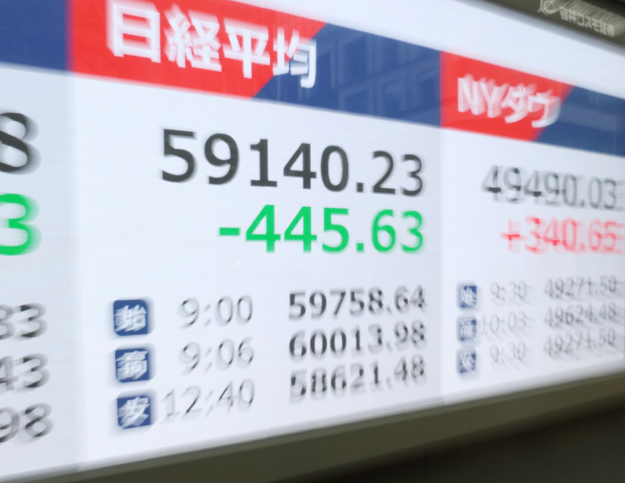 一時6万円台に乗せた日経平均株価の終値を示すモニター=23日午後、東京都中央区