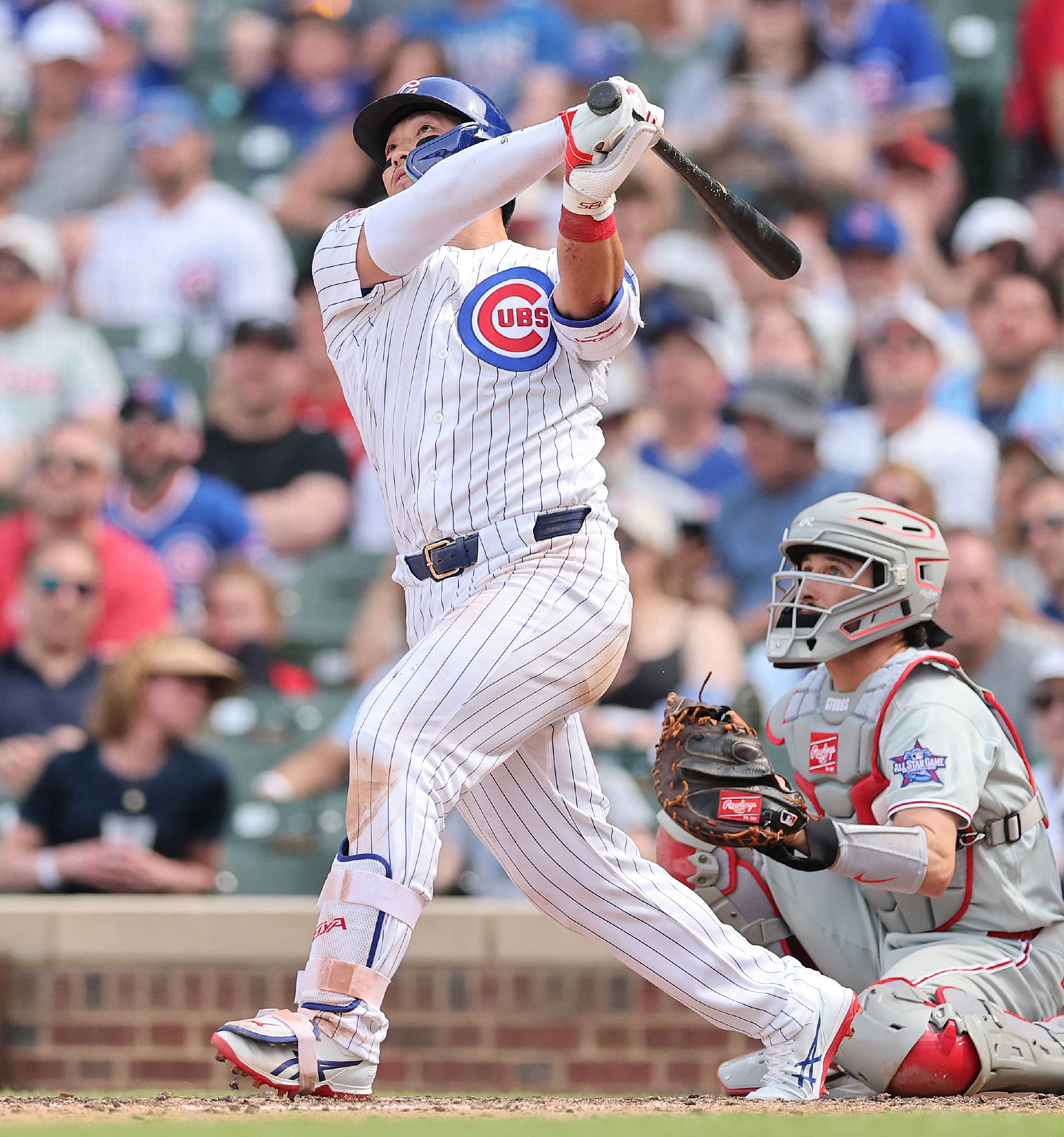 フィリーズ戦の8回、ソロ本塁打を放つカブスの鈴木。4打数3安打1打点、2四球だった。カブスは延長10回、8―7でサヨナラ勝ちし、9連勝とした=23日、シカゴ【AFP時事】