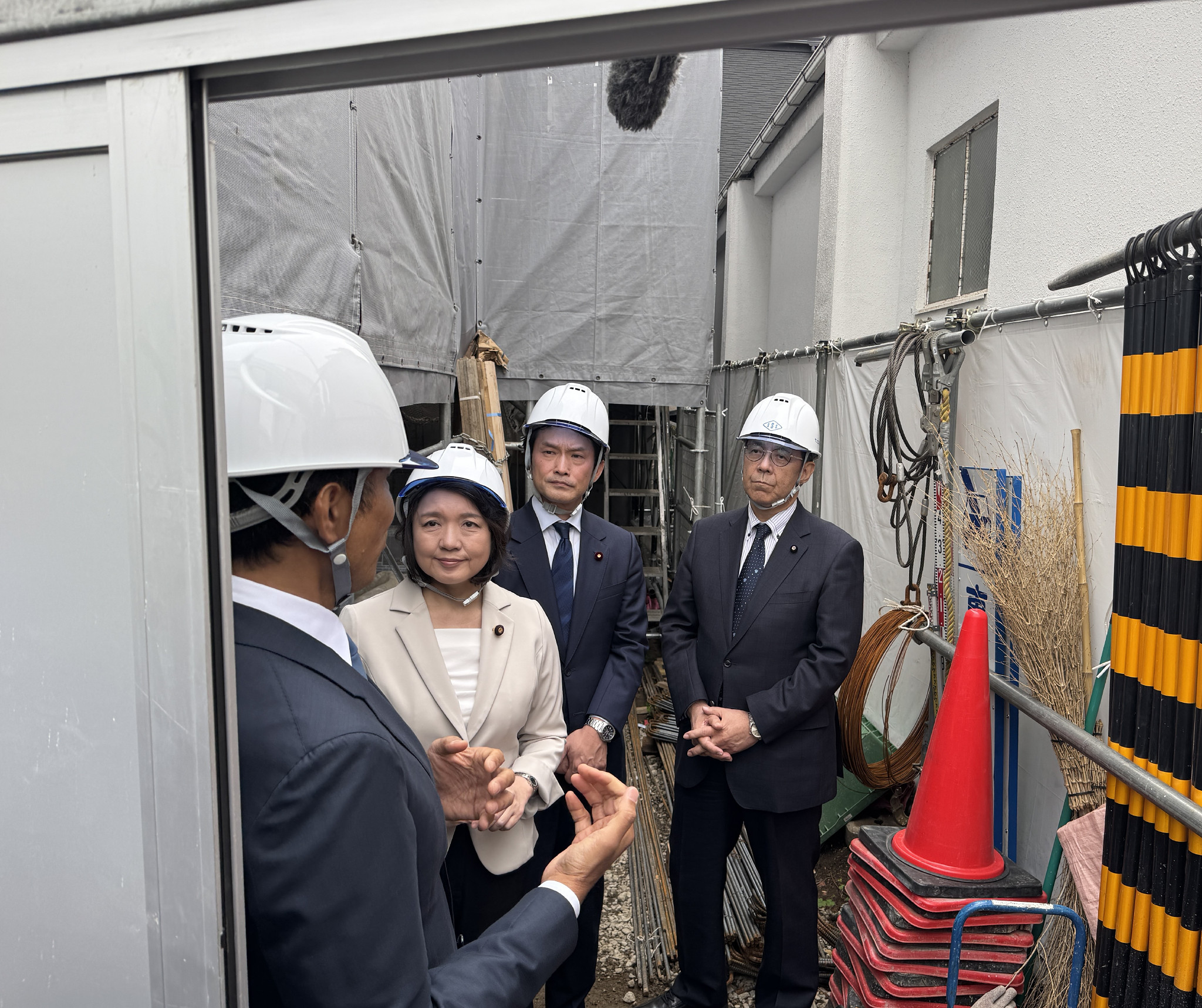 イラン情勢を受け、建設現場の視察に訪れた(右から)立憲民主党の水岡俊一代表、中道改革連合の小川淳也代表、公明党の竹谷とし子代表=24日午後、東京都品川区