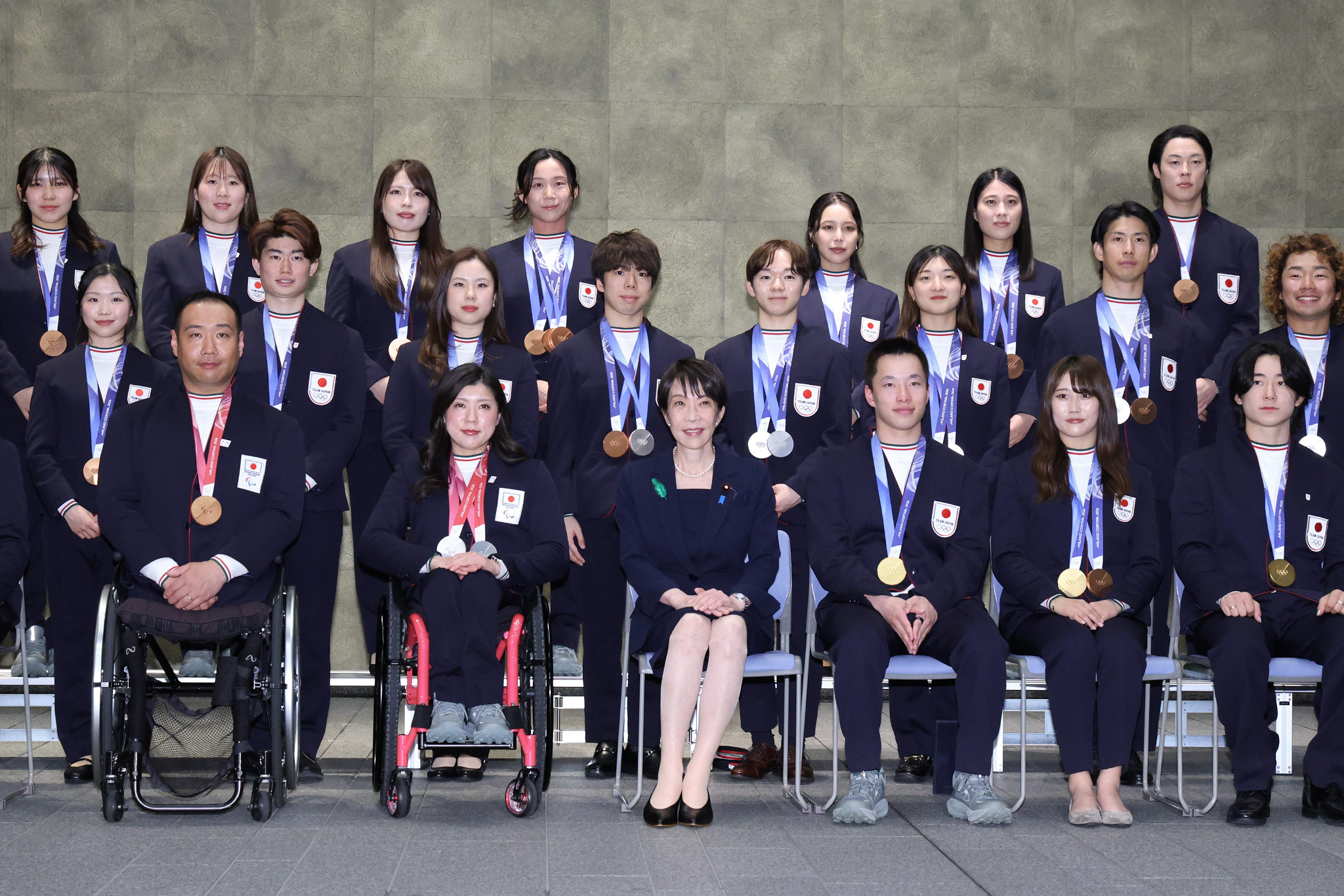 ミラノ・コルティナ五輪・パラリンピックの日本選手団が24日、高市早苗首相を表敬訪問した。首相は「皆さまの素晴らしい姿は、日本中に勇気と感動を与えてくださった」とたたえた=同日午後、首相官邸