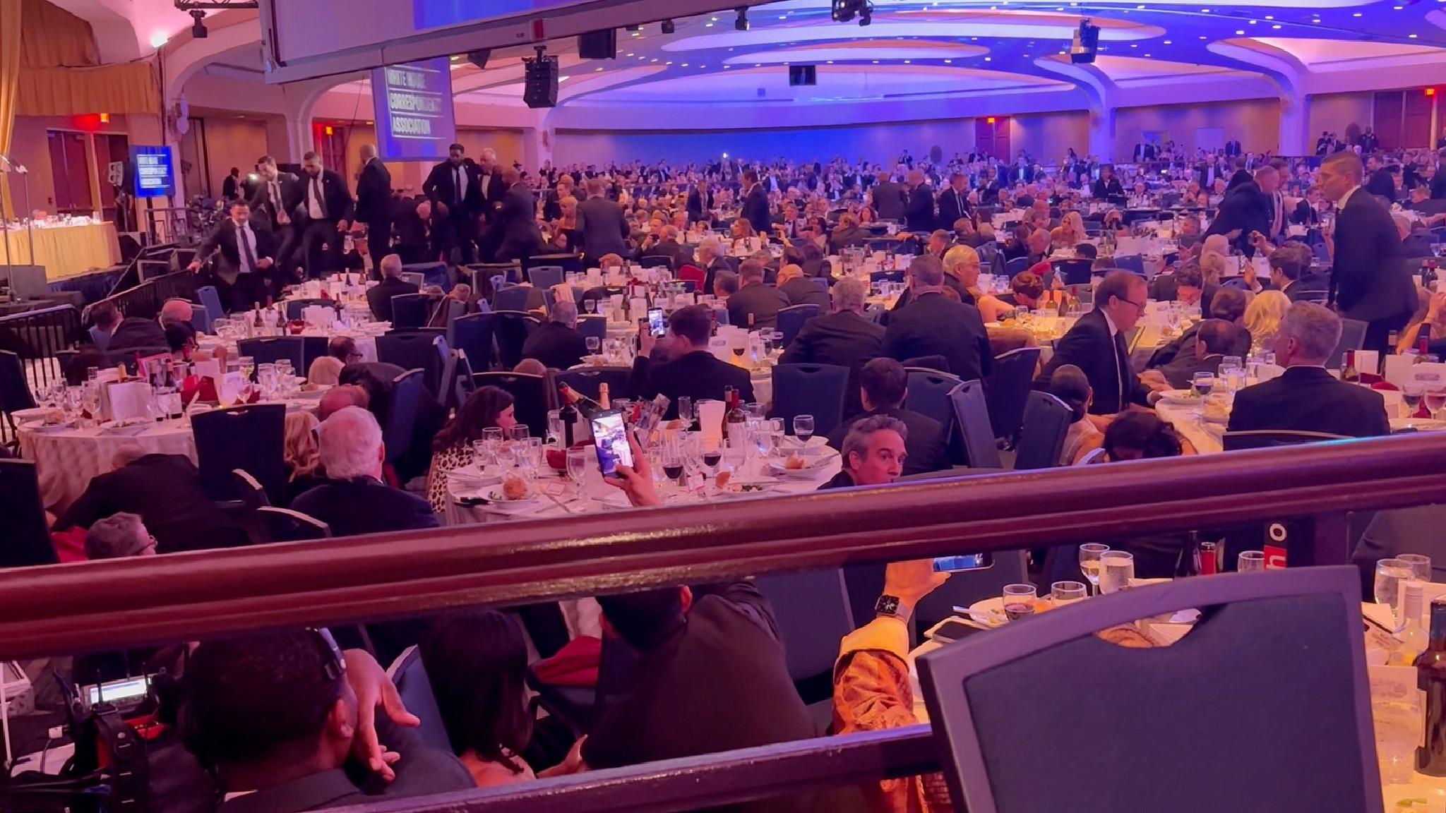 25日、トランプ米大統領が出席しワシントン市内で開かれた夕食会で、発砲音が響いた後、騒然とする会場。
