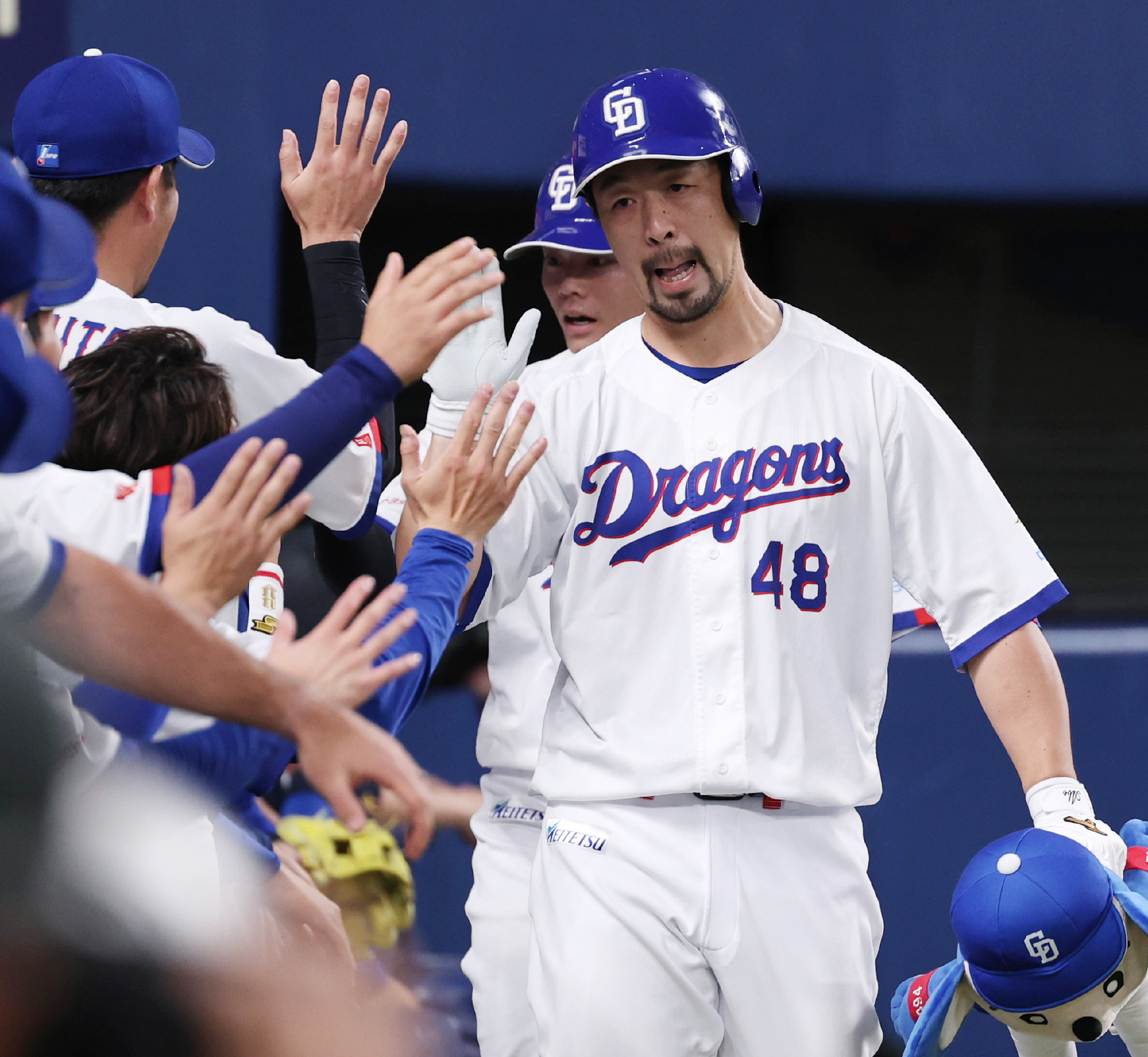 プロ野球・中日―DeNA。4回、2ランを放ち、チームメートに迎えられる中日の阿部=28日、バンテリンドーム