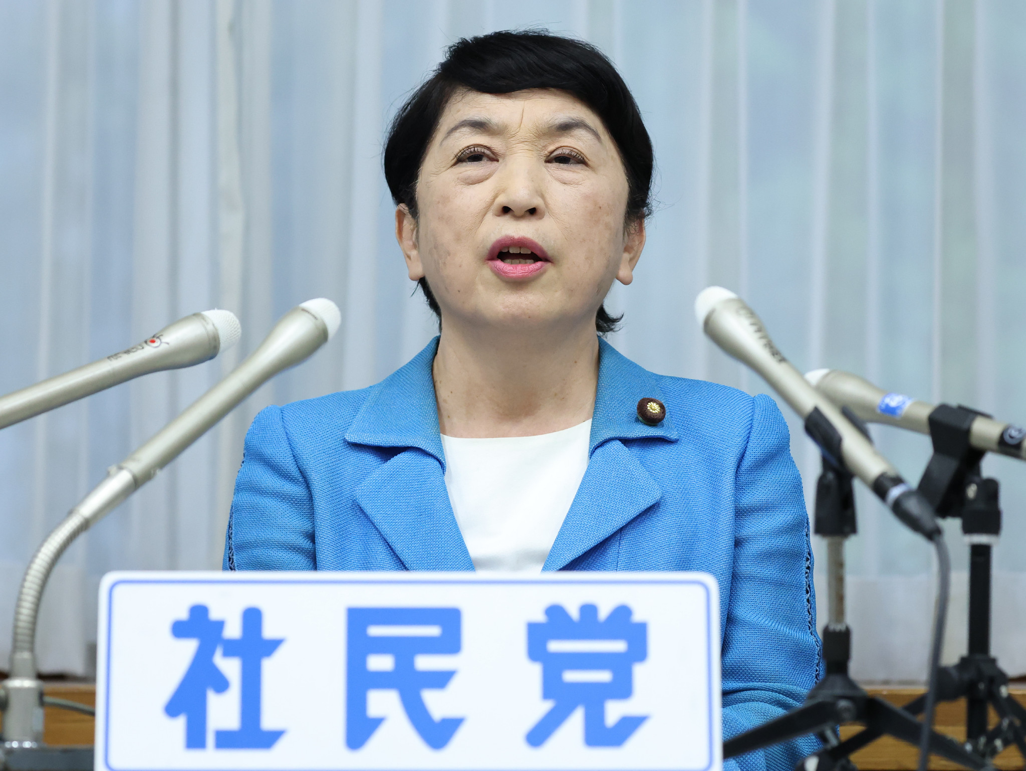 社民党大会を終え、記者会見する福島瑞穂党首=29日午後、東京都千代田区