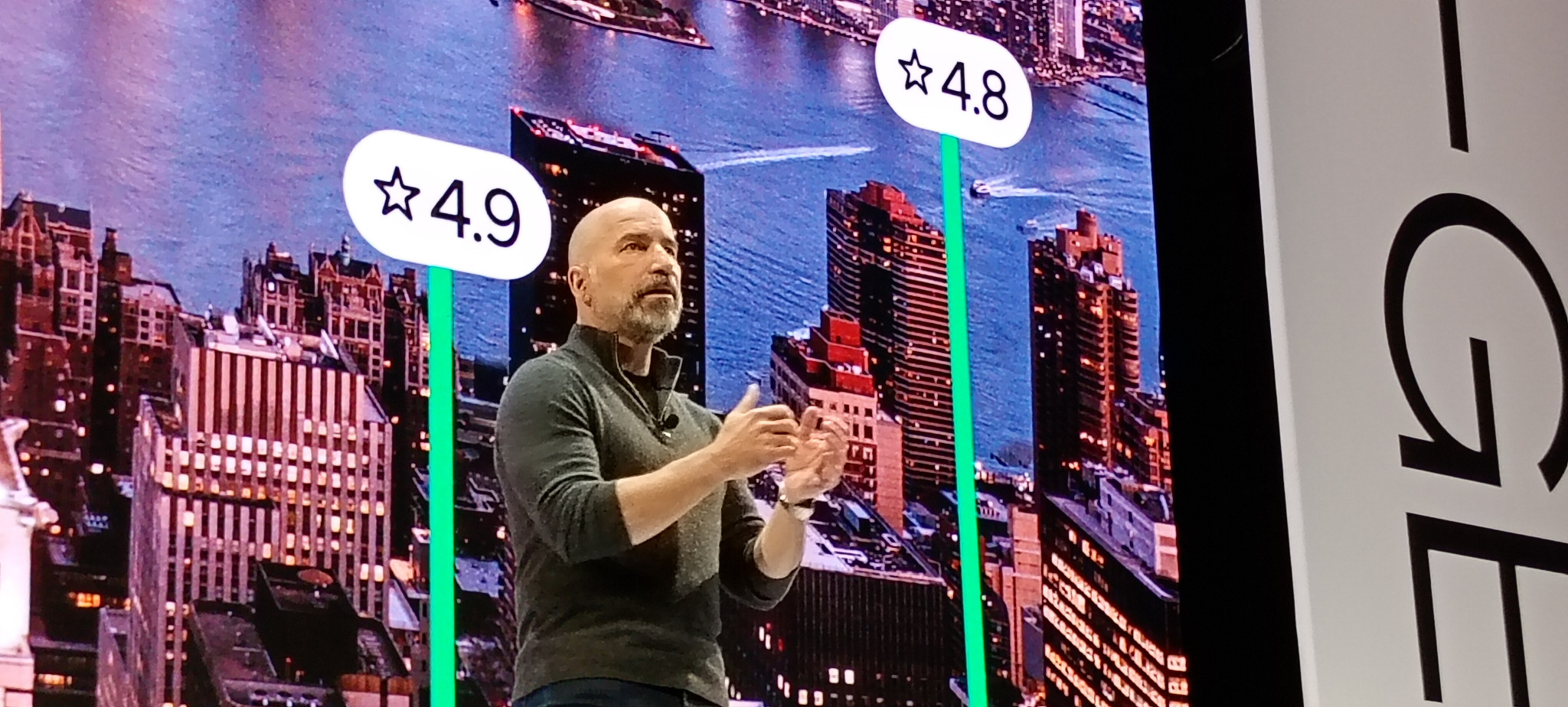 29日、米ニューヨークで旅行予約大手エクスペディア・グループとの提携について説明するウーバー・テクノロジーズのコスロシャヒ最高経営責任者(CEO)。