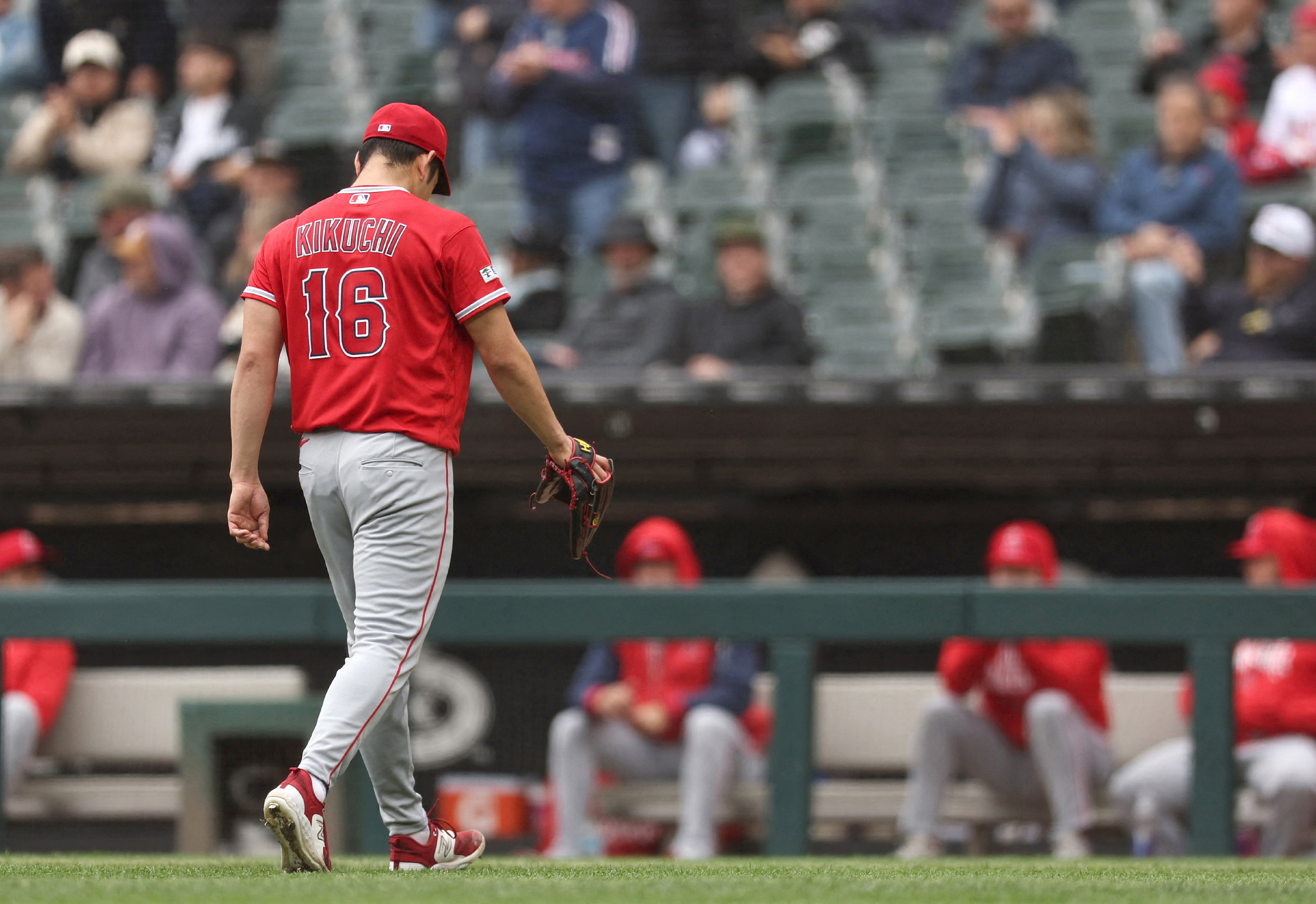 ホワイトソックス戦の3回、打者を迎える前にベンチに下がるエンゼルスの菊池=29日、シカゴ