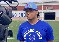 取材に応じる今永 大リーグ