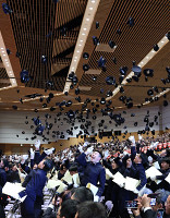 帽子を投げ退場する卒業生