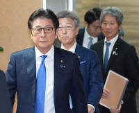 取材に応じる松山参院議員会長ら