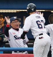 伊藤を迎える池山監督 プロ野球