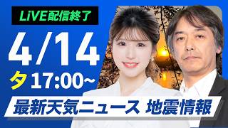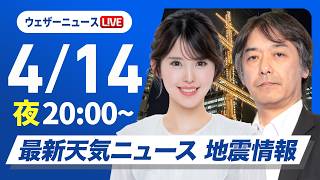 【ライブ】最新天気ニュース・地震情報 2026年4月14日(火) /明日は全国的に雨に 関東は帰宅時間帯に雨〈ウェザーニュースLiVEイブニング・小林李衣奈/宇野沢達也〉
