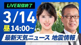 【ライブ】最新天気ニュース・地震情報 2026年3月14日(金) /太平洋側は穏やかな週末 伊豆諸島は荒天警戒〈ウェザーニュースLiVEアフタヌーン・小川千奈/森田清輝〉