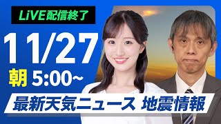 【ライブ】最新天気ニュース・地震情報 2025年11月27日(木) /西から天気下り坂 夜は荒天に〈ウェザーニュースLiVEモーニング・ 田辺真南葉/芳野達郎〉